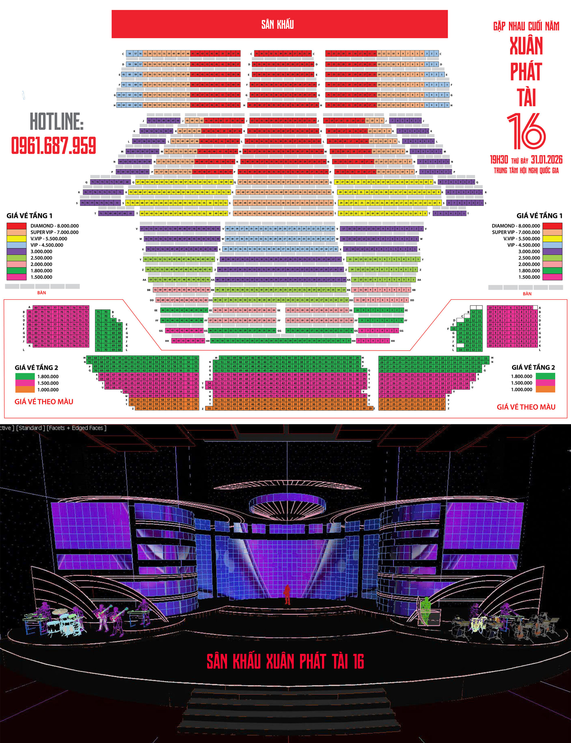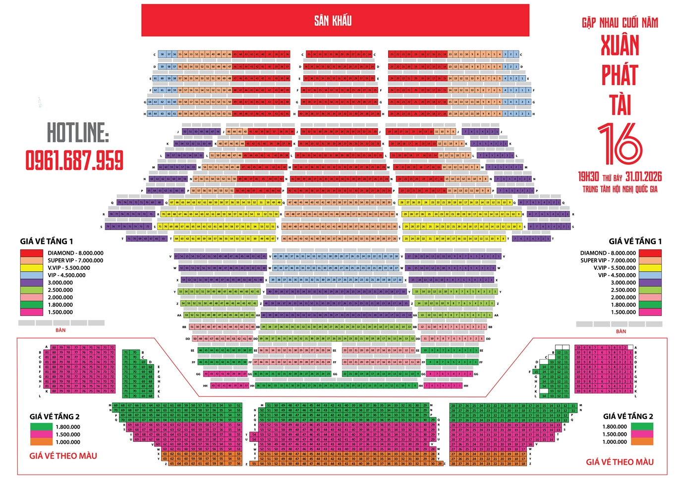 Giá vé: 1.000.000 – 1.500.000 – 1.800.000 – 2.000.000 – 2.500.000 – 3.000.000 – VIP 4.500.000 – V.VIP: 5.500.000 – SUPER VIP: 7.000.000 – DIAMOND: 8.000.000